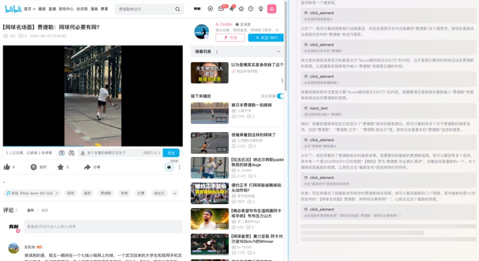 为了验证其对现实场景的适应能力,我们设置了一个更“接地气”的任务:前往 B 站查找费德勒的最新视频,并对其中一个播放画面进行截图。设置好目标后点击 Run,Agent 自动开启任务流程: