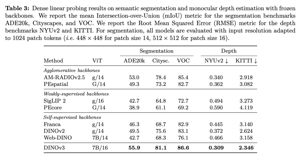 在各种密集预测(dense prediction)任务中,DINOv3的骨干网络表现出色,展现出对场景结构和物理属性的深刻理解。