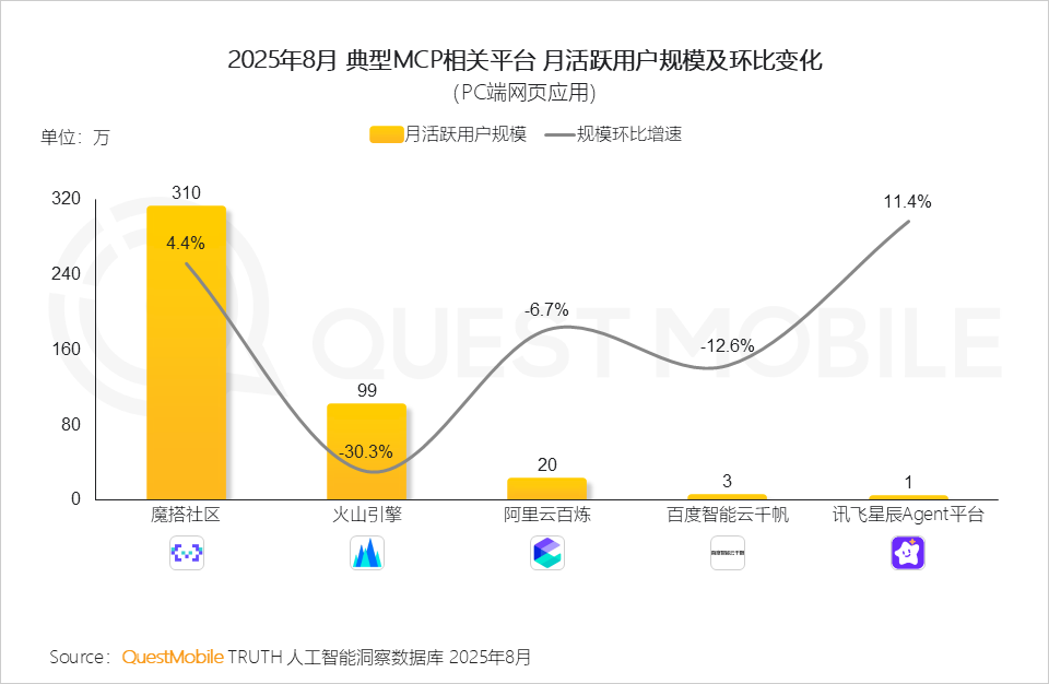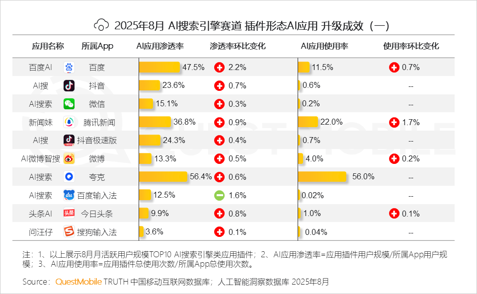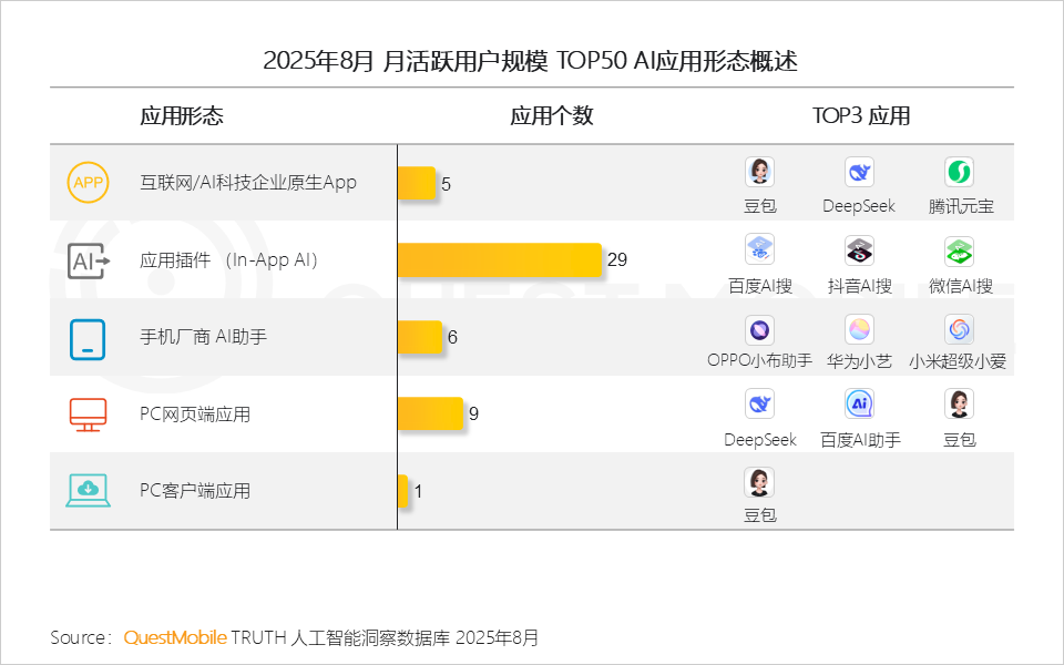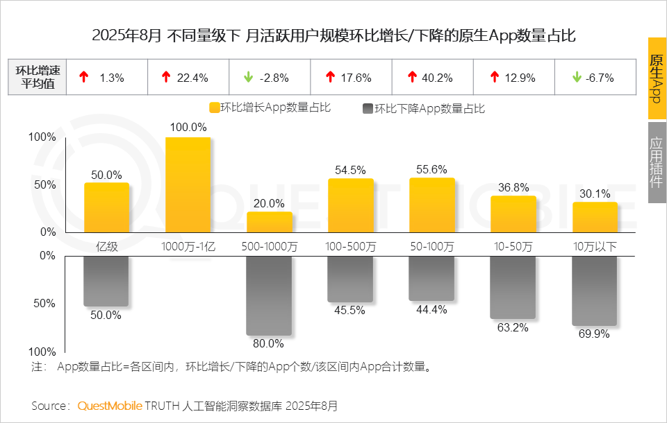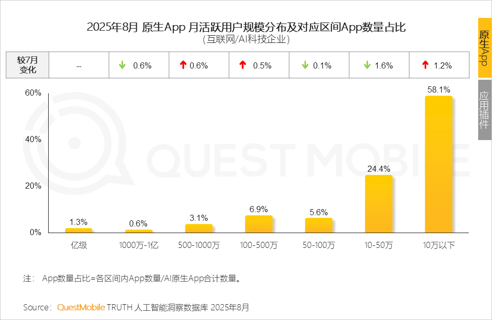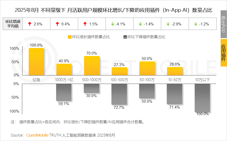 1、原生App整体规模格局不变:头部应用稳定,但长尾效应更明显,8成以上应用(50万以下)难以突破用户规模瓶颈2、QuestMobile数据显示, 2025年8月,亿级应用活跃用户规模较上月平均增长1.3%,展现出“强者恒强”现象,而尾部(10万以下)则下降6.7%3、然而在“强者恒强”的亿级应用内部,格局已悄然发生变化,豆包以6.6%的环比增速取代DeepSeek,重新回归原生App阵营下TOP1应用此外,蚂蚁集团旗下AQ App(医疗领域)以60.1%的环比增速首次入围原生App TOP10应用。4、与原生App相似,插件形态的AI应用格局稳定,头部应用为主要增长动能,500万以下应用难有新玩家突围5、QuestMobile数据显示,千万以上插件应用涨势良好,但500万以下应用平均环比增速全部下滑“轻量化”是插件形态应用的“起步”优势,这或为市场带来启发:当面临增速困境的时候,应当快速调整,要么升维创新,要么降维聚焦。