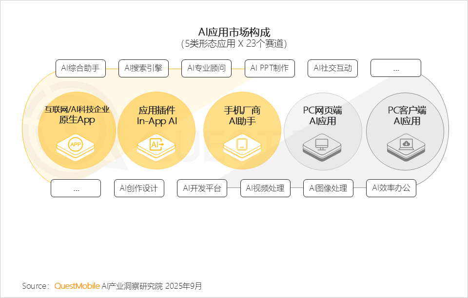 按照“行动意见”制定的阶段性目标,到2030年新一代智能终端/智能体普及率超过90%。对照8月份的用户规模粗略估算,也意味着接下来五年的市场增量空间巨大,这也成了当下发展的巨大动力:五大类应用形态争相辉映、23个应用赛道百花齐放!