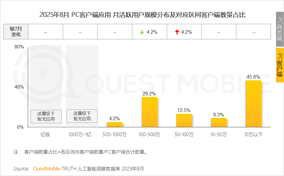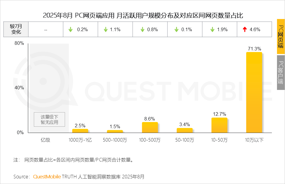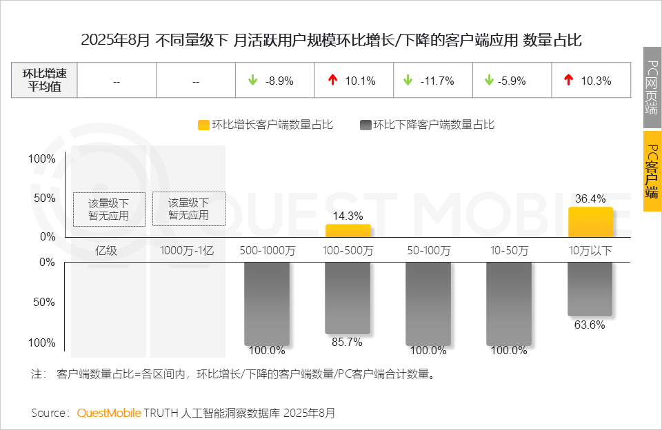 1、10万以下量级网页端应用属于“沉默的大多数”;排除移动端替代因素,PC网页端并非孕育爆款应用的土壤,而是大量高度专业化、垂直化、小众化工具的聚集地2、几乎七成以上网页端应用均面临流量下滑;或许市场应重新思考,在高度碎片化的情况下,如何精准满足垂直需求、将网页应用做深做透QuestMobile数据显示,10-50万量级的网页平均环比增速94.5%,但主要由百川大模型开放平台带动(由0.27万增长至11.87万)。3、网页应用的“做深做透”各家解法各有不同,但无外乎场景-技术-生态三重穿透QuestMobile数据显示,腾讯元宝网页端应用成为8月增长黑马,环比增速达41.5%。4、PC客户端本质是需求驱动的主动选择,与网页端存在一定的漏斗式转化路径,但转化率受限于需求强度QuestMobile数据显示,2025年8月,六成以上客户端应用用户规模在100万以下,且暂未出现千万以上体量客户端应用。5、与网页端处境相似,绝大部分客户端应用规模环比下滑;因此,客户端的解题思路不能简单的以“用户沉淀”关系来看待