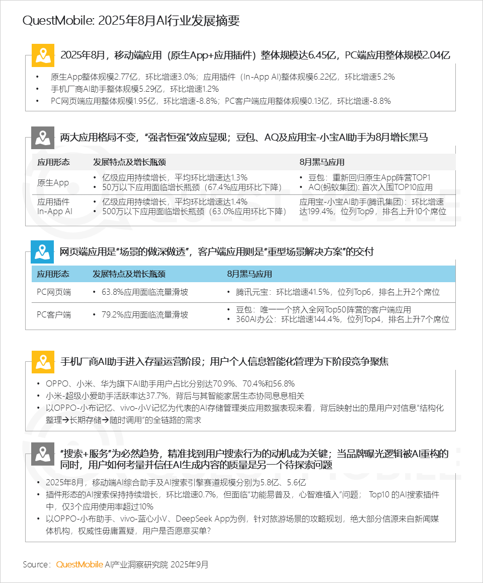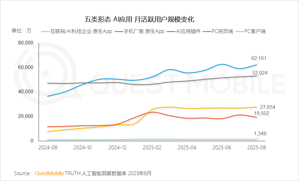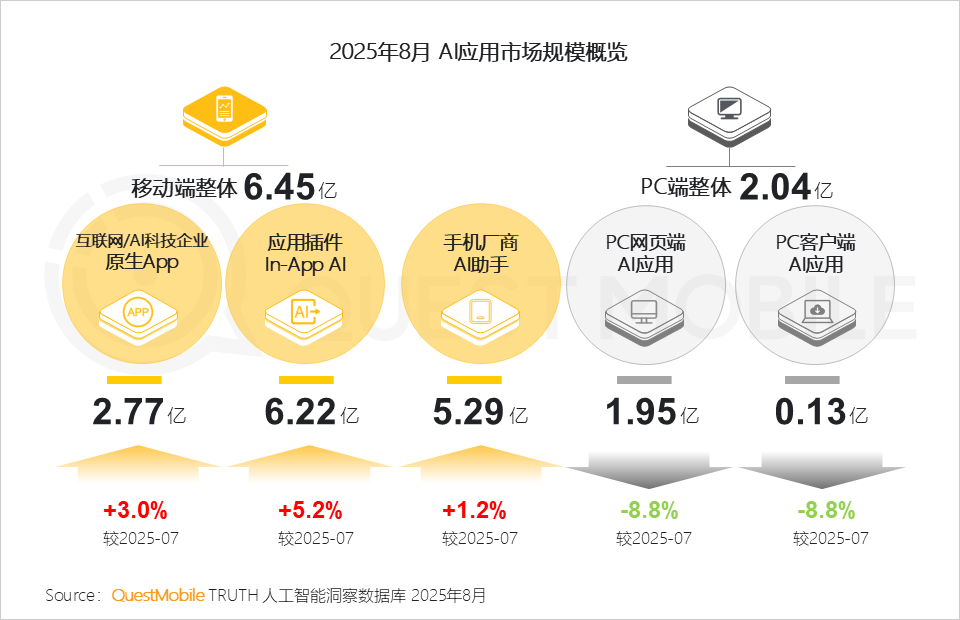 QuestMobile数据显示,截止到2025年8月,互联网及AI科技企业原生APP用户规模2.77亿,应用插件(In-App AI)用户规模6.22亿,两大AI应用整体规模达6.45亿;手机厂商AI助手用户规模5.29亿;PC端应用用户规模达到2.04亿,其中,网页端用户规模1.95亿,客户端用户规模0.13亿。