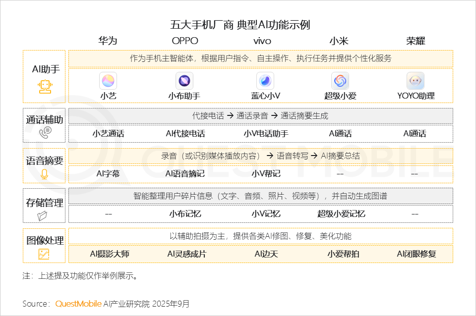 2、活跃率及粘性指标则从另一个角度诠释用户对AI助手的依赖程度;次数与时长的博弈意味着未来AI助手需要从简单的“功能触发”向“生活助理”转型从数据表现来看,小米的AI与智能家居协同已为其构建起生态护城河,其超级小爱助手活跃率达37.7%;OPPO的AI功能侧重于更轻、更快的场景交互。3、此外,厂商在其他AI功能上的布局可以用“同质化中求创新”来总结其中,AI语音摘要是厂商端侧大模型和算力优化的“较量”,信息存储与管理或成为下一阶段竞争焦点,背后意味着对用户个人数据库的智能化管理能力。