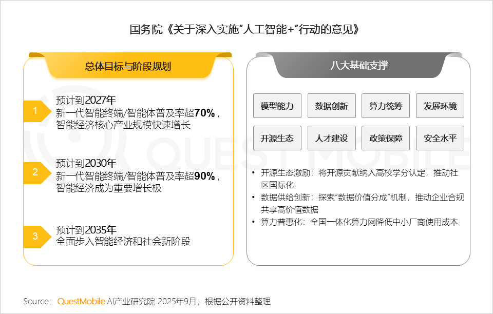 言归正传,今天就给大家分享一下 2025年8月AI应用行业月度报告。随着《关于深入实施“人工智能+”行动的意见》的发布,首次提出了2027年、2030年、2035年三个时间点的目标,以及提升模型基础能力、加强数据供给创新、强化算力统筹和促进开源生态等八大支撑点,带动了行业新一轮发展热情。