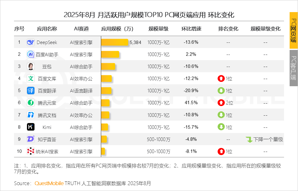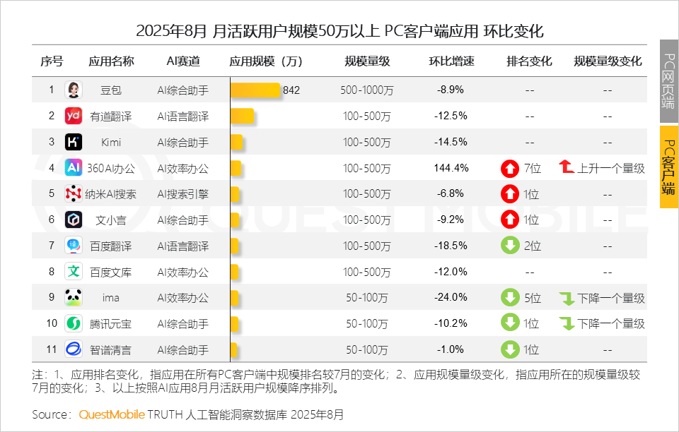 6、若网页端应用需聚焦“场景做深做透” ,那么客户端应用则需构建“重型场景解决方案”,其中,底层技术的突破性重构尤为关键360AI办公或许给出了一个启发性的范式,QuestMobile数据显示,2025年8月,360AI办公客户端应用环比增速为144.4%,规模量级从50-100万晋级至100-500万梯队。![]()