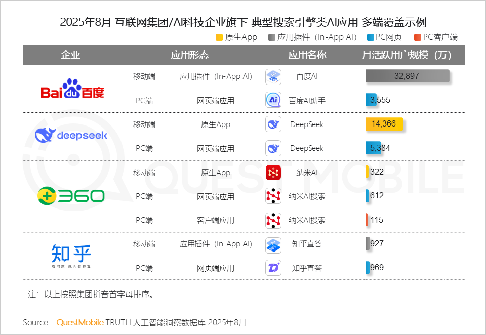1、2025年8月,原生App、In-App AI及手机厂商AI助手均持续保持稳定增速,整体规模分别达6.45亿和5.29亿;PC端未如预期,两类应用8月环比双双下滑2、与此同时,移动端三类应用Token消耗量保持同步增长,环比增速分别达3.8%、4.4%及1.3%3、赛道双寡头格局不变;AI信息检索成为8月最大黑马赛道,反映出市场对信息高效获取的高度需求QuestMobile数据显示,2025年8月AI信息检索赛道用户规模环比增速达39.0%,提升至7,353万。4、月活跃用户规模TOP50AI应用中,超过半数来自In-App形态的插件应用;豆包成为唯一一个跻身榜单的PC客户端应用,背后与其过往的用户积累而形成的跨端效应有关5、同一应用的多端覆盖是当下普遍现象,其核心价值在于让AI从技术能力进化为场景服务多端覆盖所具备的连续性让用户感知并体验的是一场无缝衔接的全场景服务。