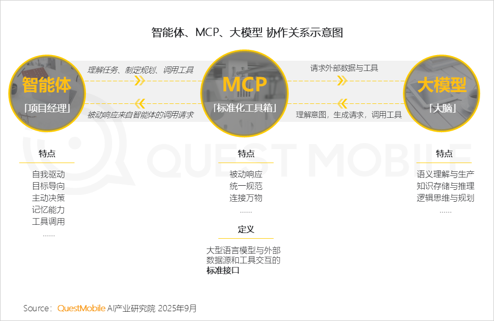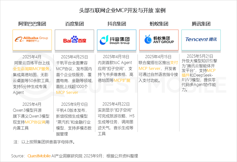 4、当“搜索+服务”已成为行业共识,而决定这一模式的关键在于如何精准激发用户的主动搜索行为:它既是任务起点,更是商业价值的源头5、AI搜索时代,品牌/商家的曝光路径已被重构,那么摆在面前的是用户会如何权衡AI生成内容的质量和可靠度:信源的权威性?多元性?生动性?实用性?6、MCP作为大模型与外部数据源、工具间的“智能连接器”,将推动AI搜索从“关键词匹配”到“信源智能路由”的新范式7、头部互联网企业正通过“模型开源、工具集成、生态开放”三大路径,争夺MCP时代的主导权![]()