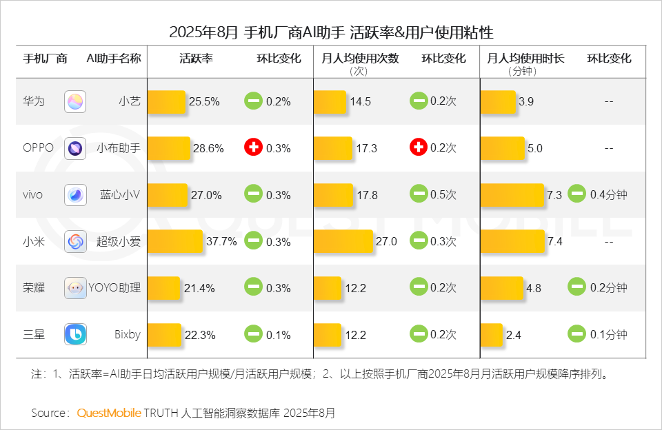 手机厂商AI助手竞争更加激烈,OPPO、小米、华为旗下AI助手用户占比分别达70.9%、70.4%和56.8%,但是,在用户活跃率上,只有小米的超级小爱用户活跃度超过30%,达到37.7%,背后的原因则是小米AI与智能家居的协同效应正在显现……