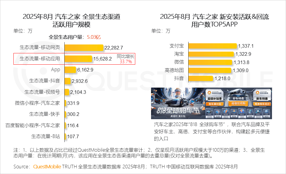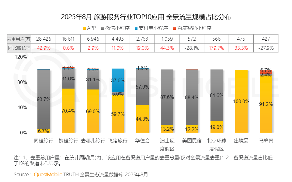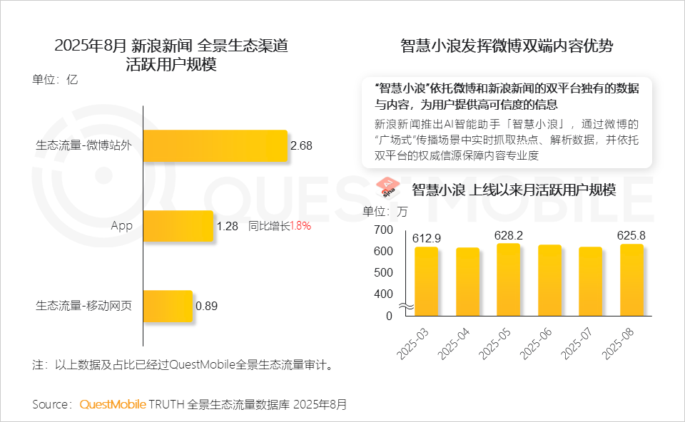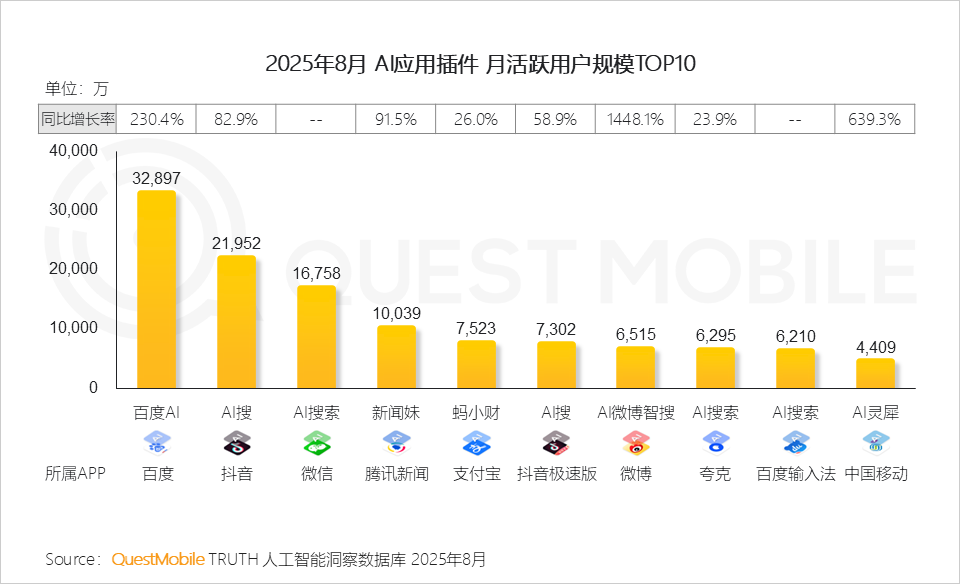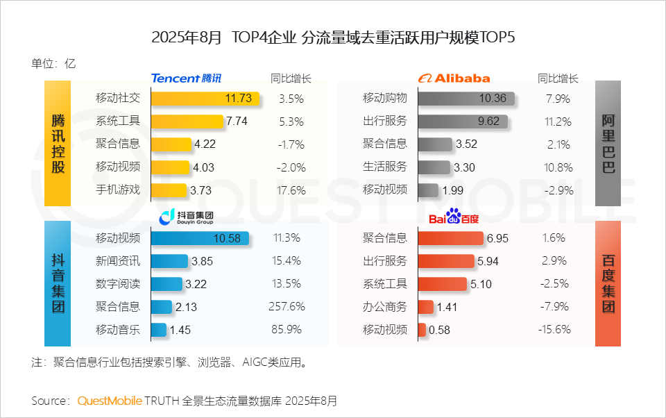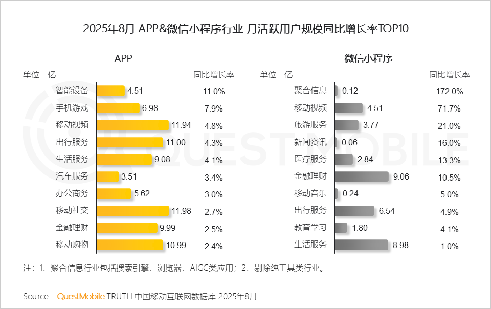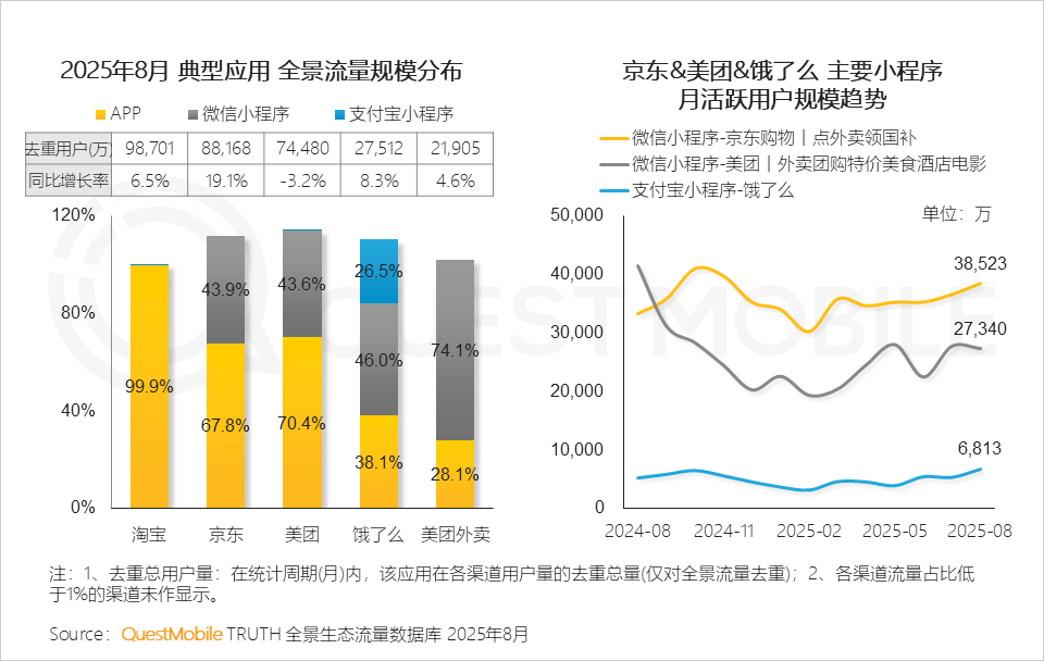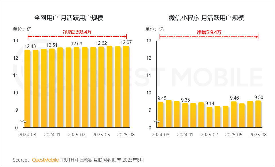 QuestMobile数据显示,2025年8月,全网流量已达到12.67亿,微信小程序端整体流量达到9.50亿,APP端增速更高。