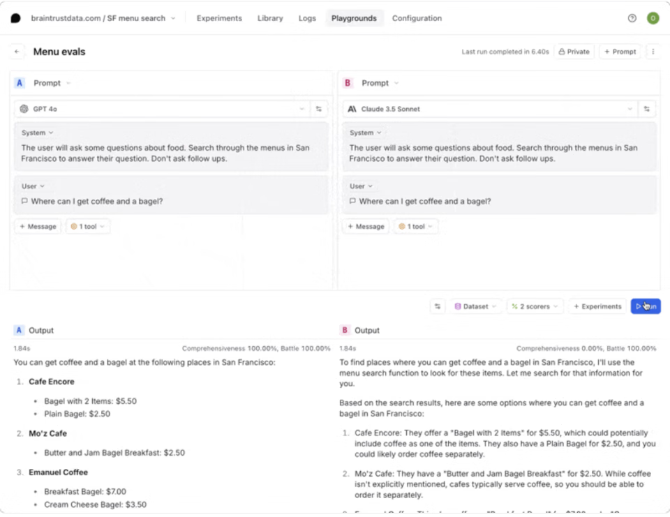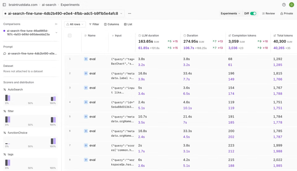 Braintrust 的产品界面设计、交互方式符合用户习惯,用户体验 UX 比较好。这具体体现在 Braintrust 的 SDK 设计优秀,数据流统一,前后端协作体验流畅,优于竞品。