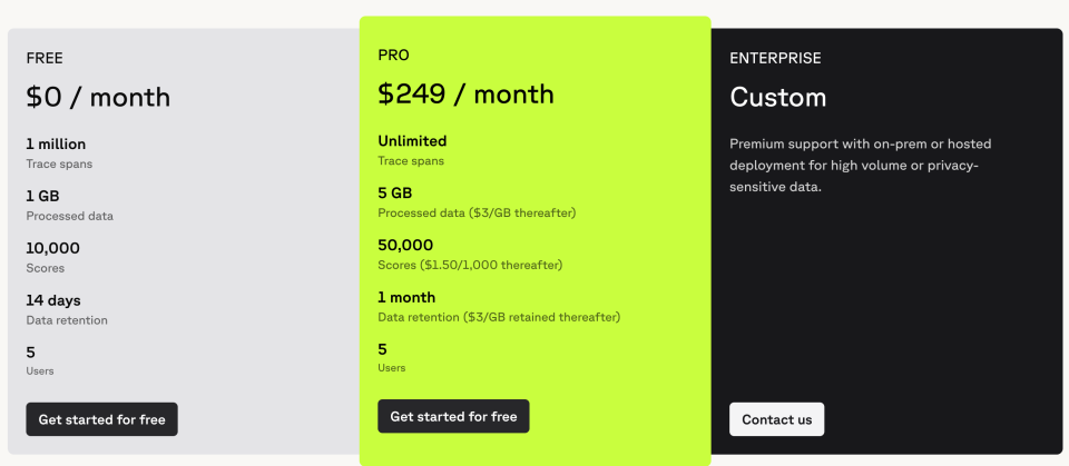 对于小型初创公司: 假设每天单个 DAU 对话消息数量为 15 条,DAU 为 1000 人,使用的是基础对话每轮对话消耗两个 spans,那么每月的 spans 为 0.9 million。对于规模以下的中小 AI 初创企业,FREE plan 已经足够。