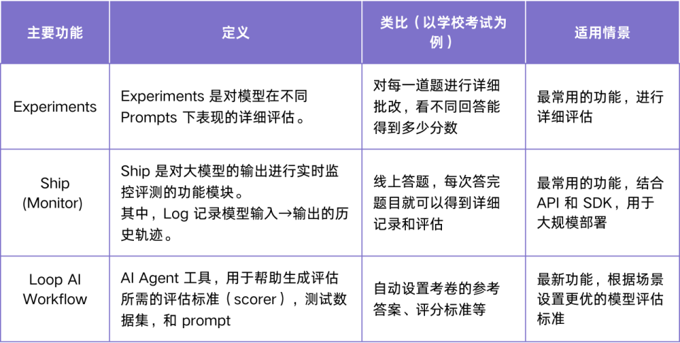 Braintrust 的核心功能包括 Eval、Ship 和其最新推出的嵌入全流程的 Loop AI。