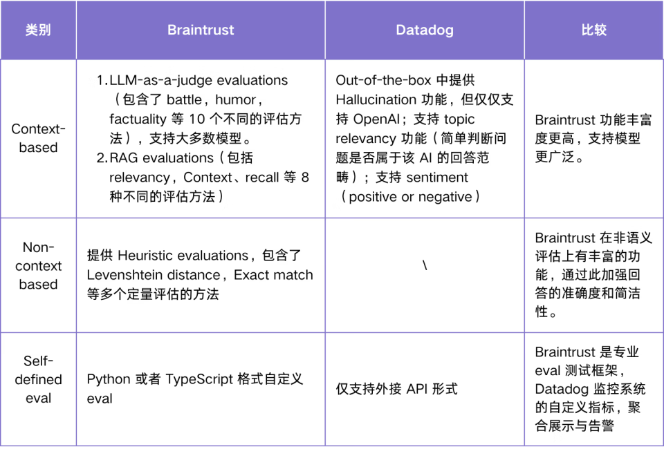 1.Braintrust 在 LLM eval 上具有极强的差异化优势,评估体系 Scorer 极其丰富且更精细化——Braintrust 更符合 LLM“质量评估和产品优化”的逻辑。Datadog 的评估体系相对简单。下表提供了相关功能的比对分析: