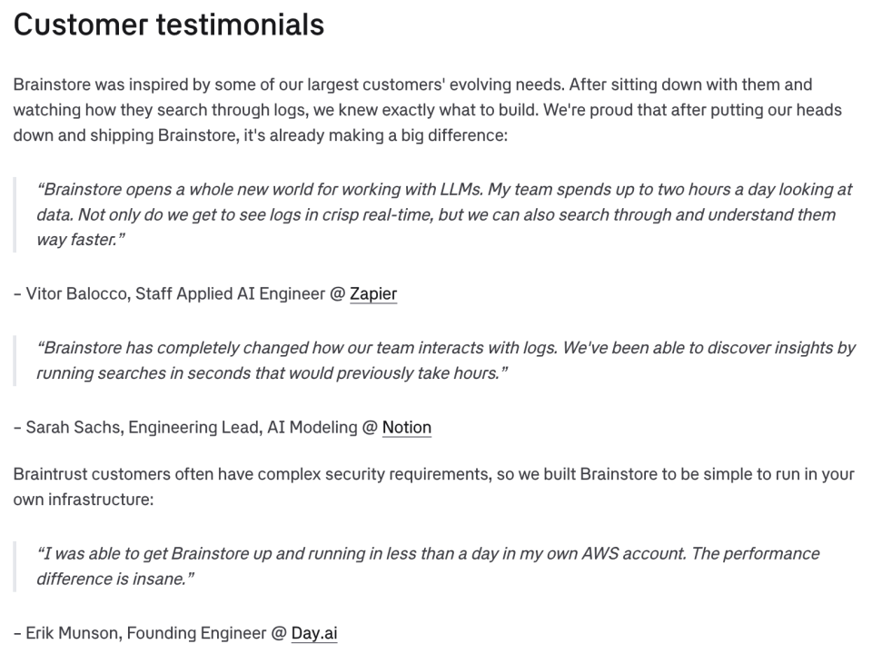 从客户来看,Braintrust 的行动力是客户反馈时最常提及的优势。较快的创新能力意味着: