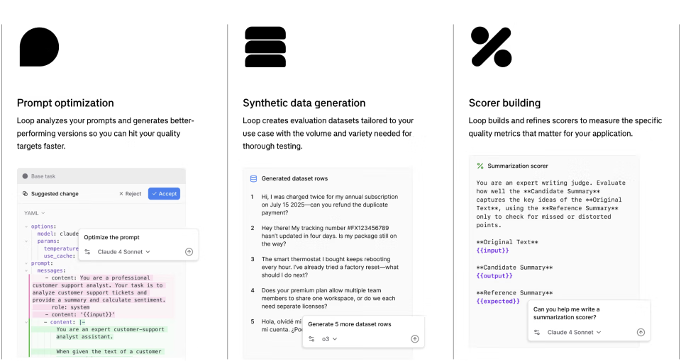 Loop 是 Braintrust 2025 年下半年全新发布的 AI Workflow 功能,可以把以上两个核心 features 自动化,实现以下核心功能: