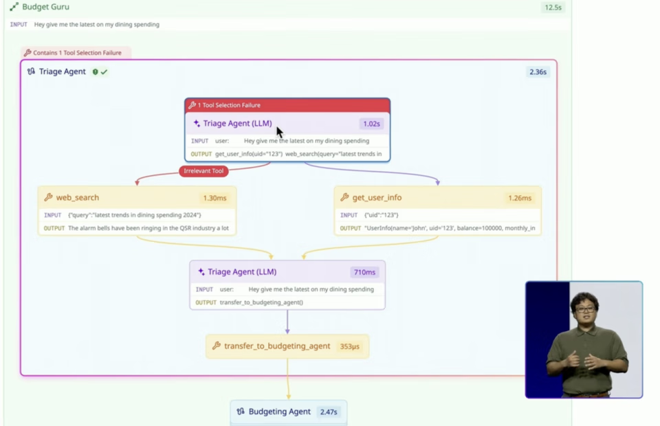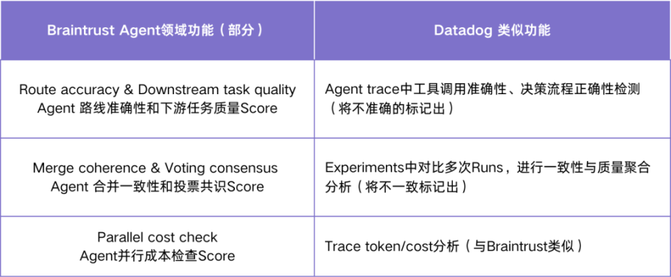 b.在 Agent 领域,Braintrust 同样对于不同形态的 LLM Agent 结构提供了丰富的针对“研发环节评估”的工具。Datadog 类似功能的设计理念同样倾向于“告警和运维管理”。