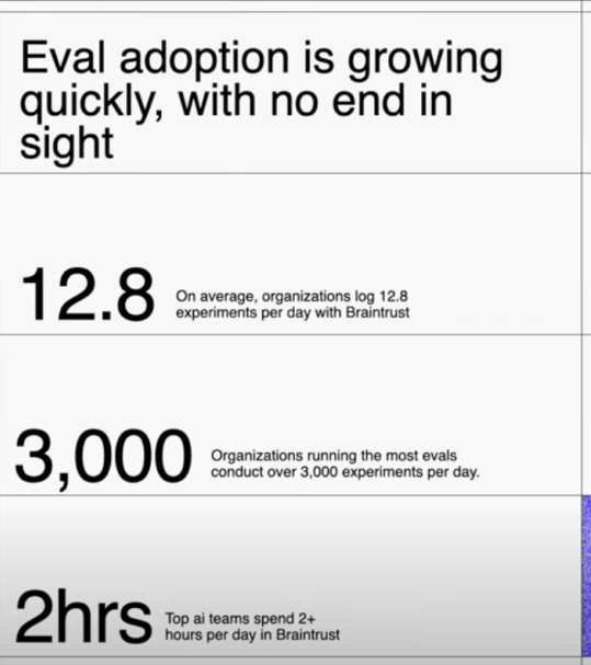 客户在高强度工程场景下(如日调用百万级的教育问答、财报解析),依赖 Braintrust 做可验证、可监控的实验与对比,当前已有约 3000 家客户每日运行超 3000 次实验,使用频率高。