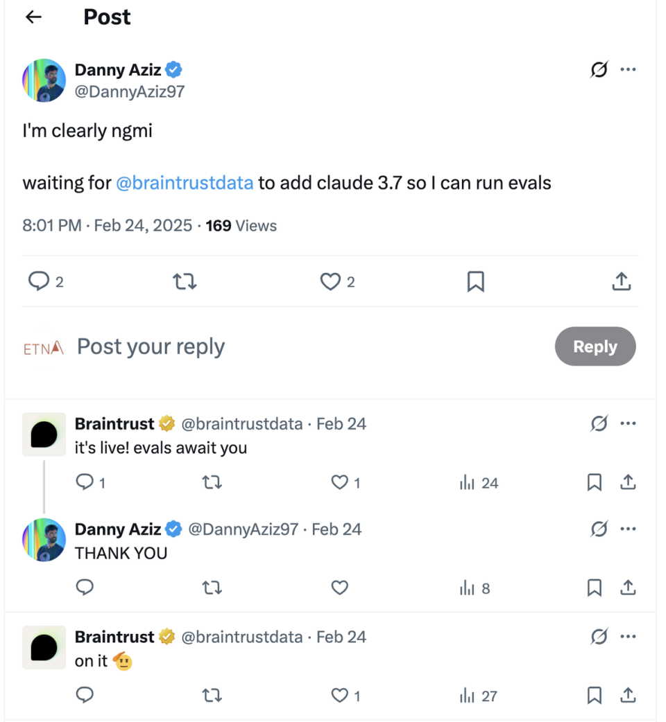 1.从解决客诉的角度来看,通过 X 平台观察客户在相关 tag 下的反馈。从下图的反馈中可以看出,Braintrust 对于自己推出的产品有快速且清晰的产品解决方案,快速执行能力获得了客户的认可。同时,今年二月份,面对客户关于把 Gemini AI 接入的请求,braintrust 的团队在一天之内就从“on it”到给出产品上线。这正如 perplexity 的成功故事一样,Braintrust 的团队具有极高的执行力,能在短时间响应客户需求,并且更新产品迭代。
