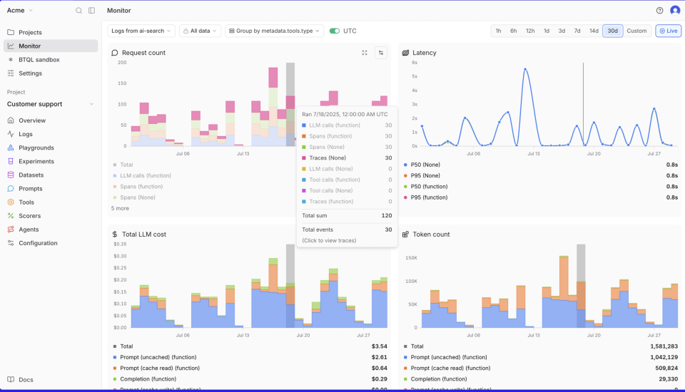 3.规模化的日志 log 提取:使用 Brainstore 提取和存储所有日志(Note:Brainstore 是 Braintrust 专为企业级搜索和分析 AI 交互而设计的数据中心,适合企业大规模部署)