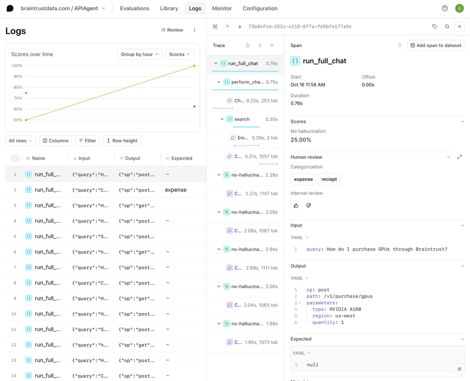 在采样方式上,Braintrust 提供 Scoring percentage:它会完整保留每一次 LLM 调用的输入与输出,但只对其中一部分执行自动化评测,从而节省算力和成本。