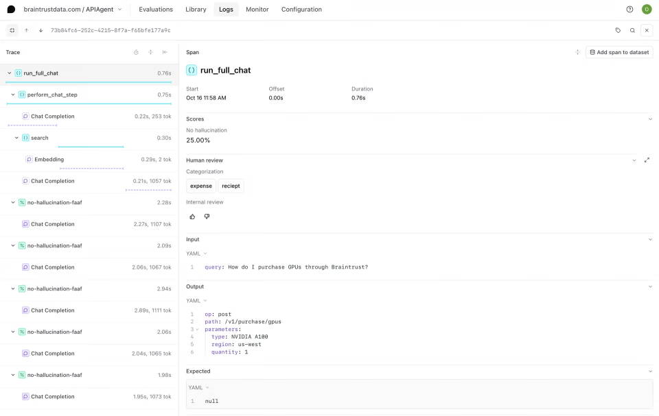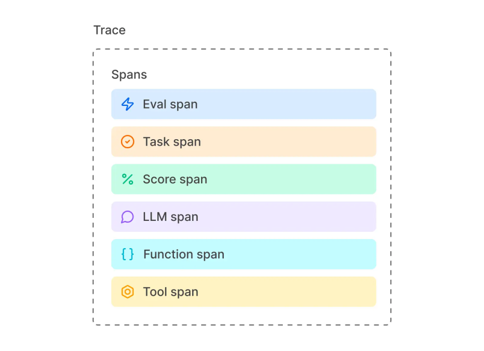 其中,类似于传统软件开发需要追踪和记录软件的行为,Braintrust 利用 Log 日志功能收集 AI 调用的步骤、模块、每个步骤的运行时间、token 数量等,并利用它们来调试代码问题、跟踪用户行为并将数据收集到统一的数据集中。Braintrust 中的 Log 由 Trace 组成,这些 Trace 记录了应用程序中的单个请求或交互,比如一次 LLM 的问答。而每一个 Trace 又由一个或多个 span 组成,每个 span 对应 LLM 一次执行中的一个工作单元(如下图所示)。因此,它们之间从宏观到微观的层级关系是 Log - Trace - Span。