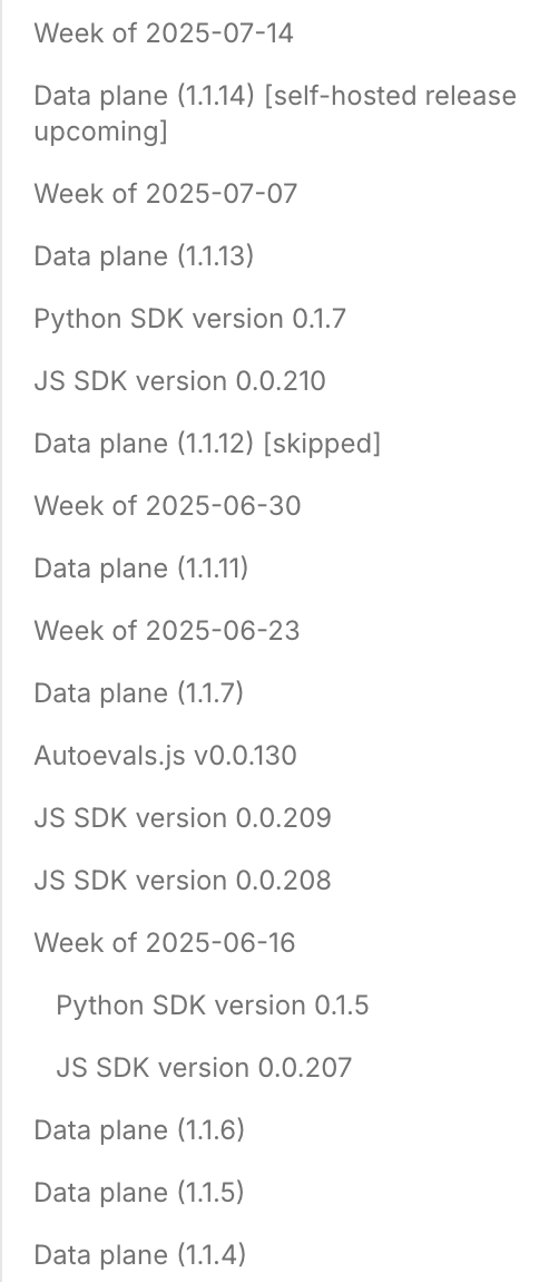 2.从产品更新的 log 上看,即使自从其 2023 年发布以来已经过去两年,Braintrust 仍然保持了每周 2-6 个更新的节奏,这说明团队的执行力和战斗力较强。