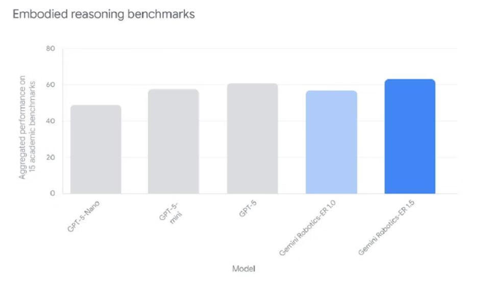 Gemini Robotics-ER 1.5在15个学术具身推理基准测试中实现了最高的综合性能,超过Gemini Robotics-ER 1.0和GPT-5等模型。