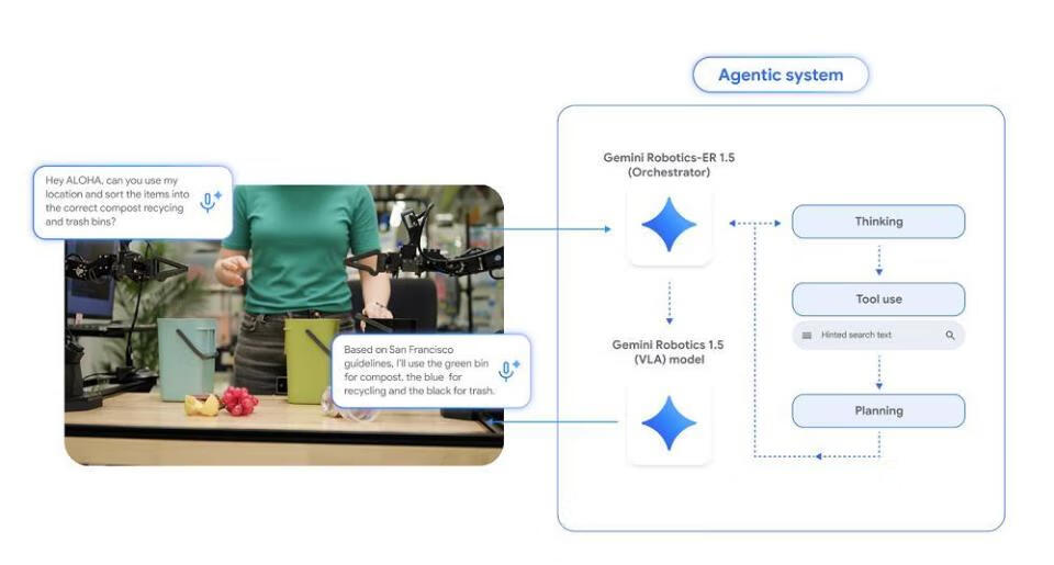 在整个体系中,Gemini Robotics-ER 1.5的定位是编排器(Orchestrator)。它接收人类指令与环境反馈,制定总体计划,再将这些计划转化为Gemini Robotics 1.5能执行的具体动作指令。它还具备调用外部工具(如网络搜索)的能力,确保机器人在面对复杂场景时依旧能够灵活应对。