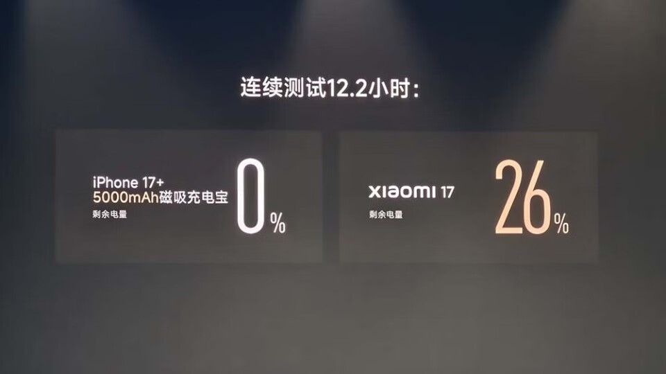 续航方面,小米17搭载了7000mAh大容量高能量密度电池,根据小米测试,连续测试12.2小时,小米17剩余电量26%,iPhone 17+5000mAh充电宝的电量已经归零。