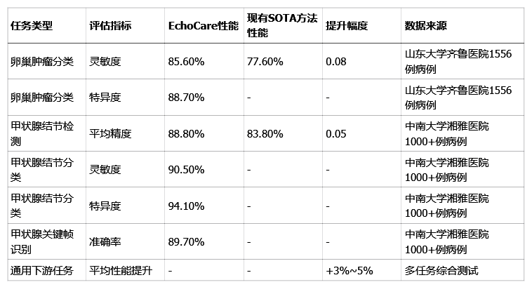 在山东大学齐鲁医院,他们分析了1556例卵巢超声病例。卵巢肿瘤的良恶性判断,是妇科超声诊断里的一大难点。结果显示,EchoCare的灵敏度达到了85.6%,特异度为88.7%。其中,灵敏度这个指标,比现有的顶尖方法提升了整整8个百分点。这意味着,它能更有效地发现恶性肿瘤,减少漏诊。