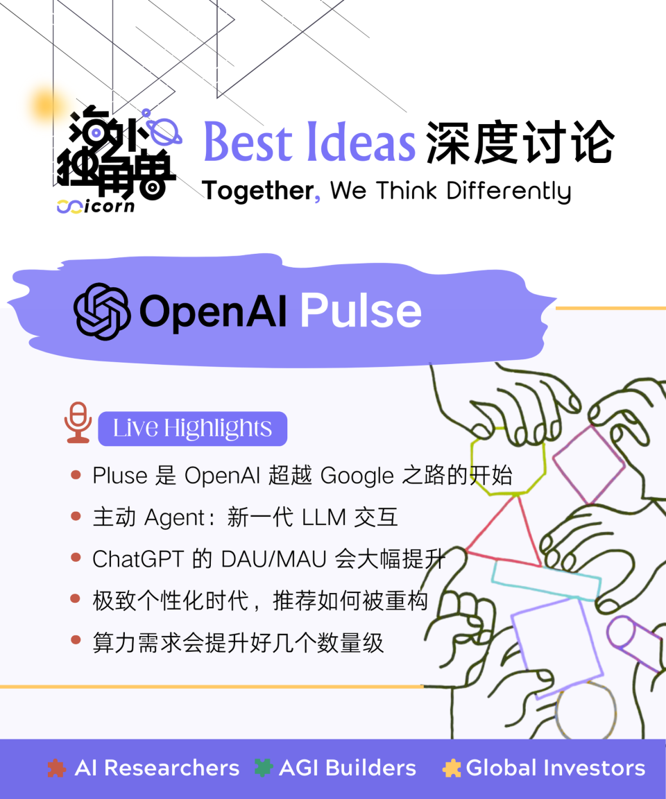 在 Pulse 发布当天,海外独角兽组织了一场「Best ideas 深度讨论」。和一线 AI researcher、产品经理、创业者和以及投资人们共享认知,从 ChatGPT Pulse 切入,对主动 Agent 交互变革背后潜藏的趋势和机会展开想象。本篇文章是我们对讨论会精华的总结及开源。