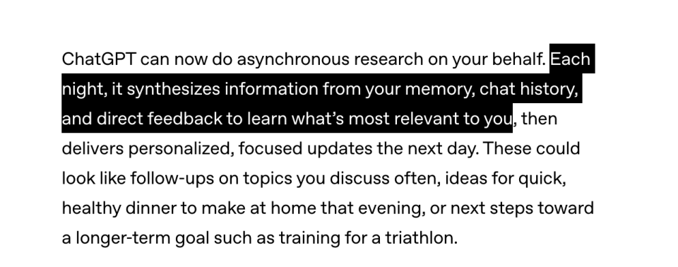 • 比如,ChatGPT 可能已经掌握了用户感兴趣的主题。当用户点击时,它很可能只是先发起一次搜索,再把实时相关信息整合、总结后推送给用户。因此,它未必真的是在每天晚上就提前计算好第二天的内容,因为大多数情况下用户并不会查看;