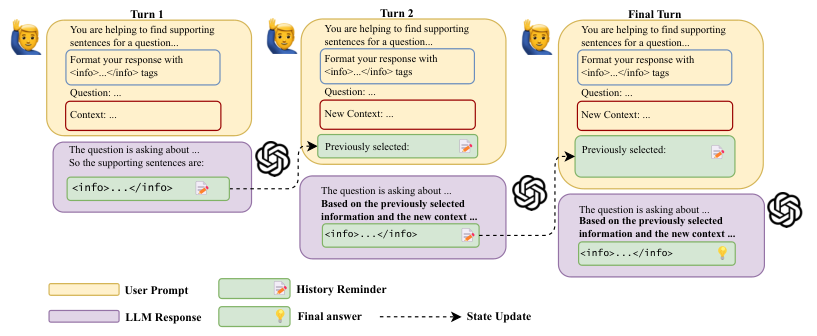 第二个叫“历史提醒”(History Reminder, HR)。这是整个策略的点睛之笔。通过一个名为“先前选择”的机制,在每一轮都非常明确地把上一轮筛选出的关键句子再次展示给模型。这就像一个秘书在旁边不停地提醒老板:“老板,别忘了,我们上次开会的核心结论是这些”。这种方式强制模型必须关注并整合所有跨越时间线的关键信息,从而有效对抗遗忘。