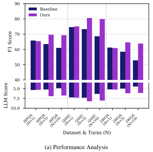 而当把“历史提醒”(HR)模块去掉后(无HR),性能则出现了灾难性的下滑,信息分数从6.91暴跌至3.74,问答分数也从7.22降到了4.68。这个结果强有力地证明了,历史提醒机制才是跨轮次推理和上下文理解的基石。