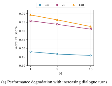 F1分数(一个衡量准确率的指标)随着对话轮数的增加,稳定地往下掉。对话轮次越多,模型表现越差。有趣的是,模型规模越大,这种性能下降反而越明显。这说明,虽然更大的模型在单次理解能力上更强,但它们同样没能解决在多轮对话中记住历史上下文这个根本性的挑战。