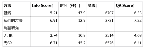 表1:主要结果和消融研究。我们的方法在有效性(Info/QA分数)和效率(时间/令牌)方面均优于基线。消融研究证明了HR和SR组件的必要性。(↑:越高越好,↓:越低越好)