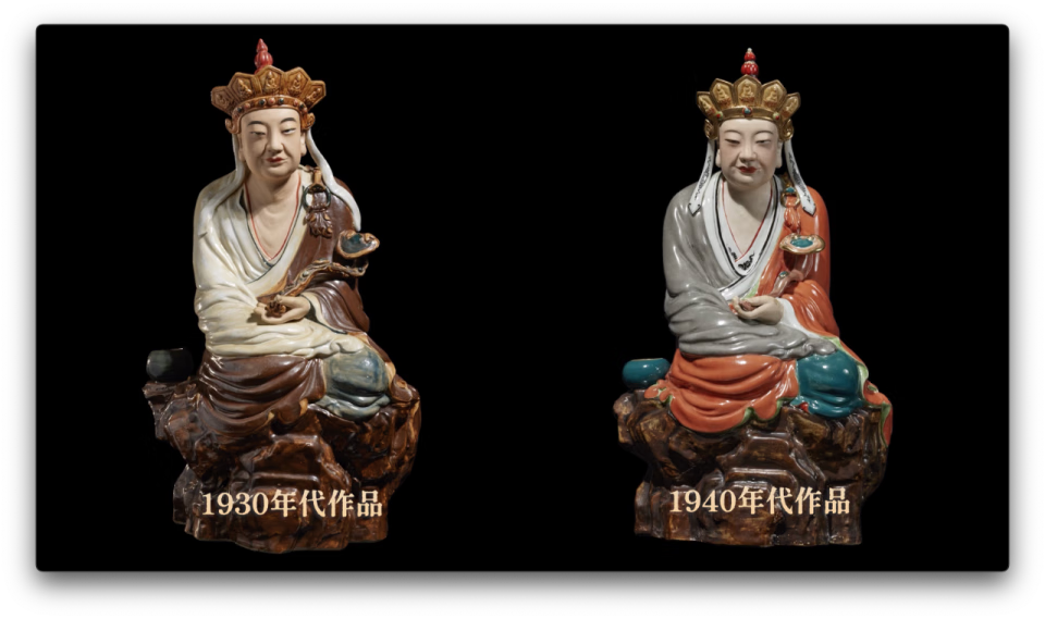 相比博物馆里的人山人海,我们在展示端上看到的细节可谓奢侈。屏幕里并排陈列了两尊无语佛,一件来自博物馆展柜,另一件则是曾龙升在1930年代创作的“上一代”无语佛。1940年代的博物馆展品釉色温润,1930年代初版则因成本和条件所限,只采用了少数几种釉料。仔细观察,两尊外形有不少差别,可以看出釉色、画工的延续,以及艺术家的精进。