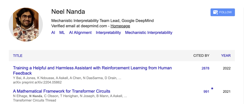 Neel 2020 年本科毕业于剑桥大学纯数学专业,曾在量化金融领域 Jane Street 和 Jump Trading 公司实习,但他觉得这并不适合自己,于是在毕业后花了一年时间探索人工智能安全。尽管涉足机械可解释性研究仅四年左右,Neel 却贡献了多项基础性成果,多篇论文被大量引用。
