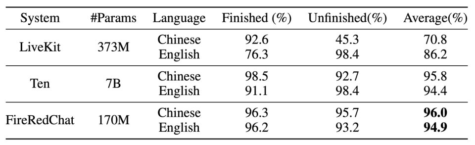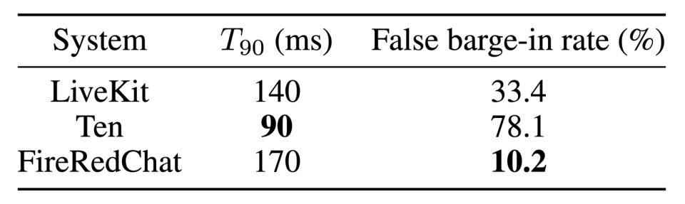 FireRedChat 设立系统级指标,聚焦真实体验的三件事:更少的误打断,更准的语义端点检测,更低的延迟。