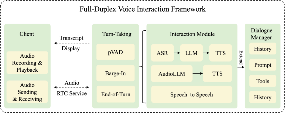 用户期待的是 “你说我听、我说你懂” 的自然对话,而非机械的一问一答。为了实现自然对话,要求系统既要能精准感知双方交互中的轮次变化,又要能抵抗外部其他说话人以及环境噪声的干扰;既要知道 “何时打断” 不出错,又要把握 “何时回复” 的最佳时机;还要摆脱闭源 API 的束缚,做到全链路可控、可私有化部署。这些挑战长期压制着开源生态的产品化落地。