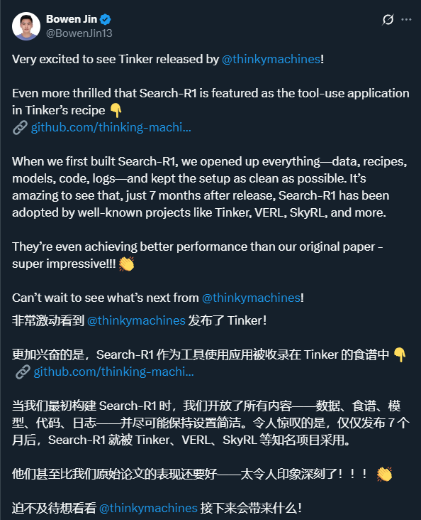伊利诺伊大学香槟分校博士生金博文表示,Tinker 的 Cookbook 中收录了他们的训练工具 ——Search-R1,这个工具可以「边推理边搜索」,感兴趣的读者可以参见《UIUC 联手谷歌发布 Search-R1:大模型学会「边想边查」,推理、搜索无缝切换》。