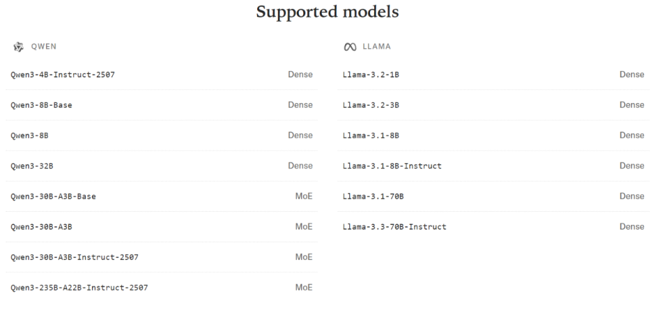 目前,Tinker 支持的模型如下所示,Qwen-235B-A22B 等前沿模型都包含在内。该公司表示,从一个小模型切换到一个大模型,就像在你的 Python 代码中更改一个字符串一样简单。Tinker 的发布是 Thinking Machines 使命的表现,即让更多人能够研究尖端模型并根据自己的需求进行定制。