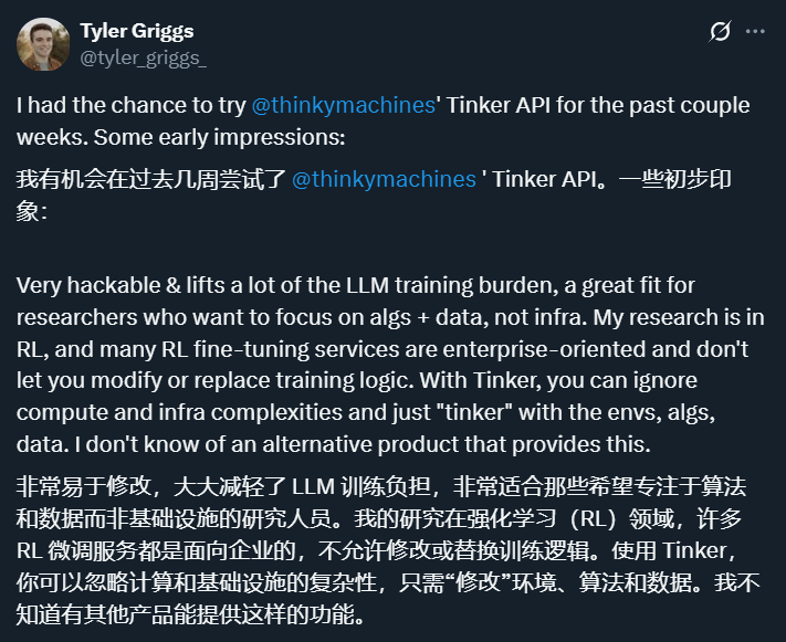 Tinker 正面向研究人员和开发人员进行内部测试,waitlist 也已开放申请。参与测试的 Anyscale 公司 CEO Robert Nishihara)表示,虽然像 VERL 和 SkyRL 这样的其他微调工具已经存在,但 Tinker 提供了卓越的抽象性与可调节性的结合(Tinker 抽象出了分布式训练的细节,但仍然让大家完全控制数据和算法)。
