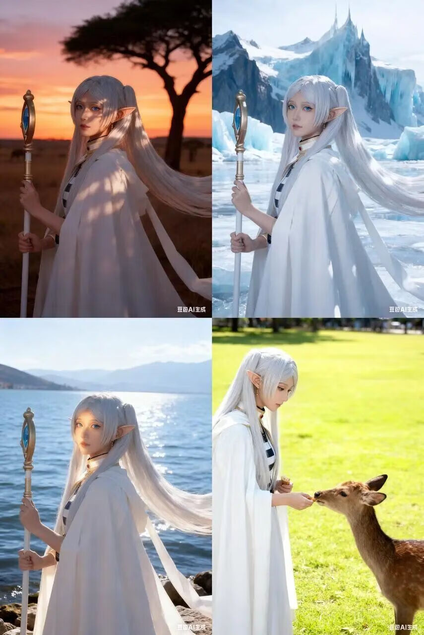比如,让芙莉莲去日本旅行,在奈良的草坪上,专心给一只小鹿喂食,看向小鹿,日系氛围,阳光明媚。