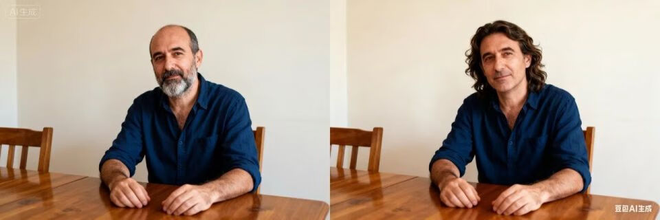 再比如,这儿有一个胡子拉碴的秃头。想让他变帅一点,直接和豆包说,去掉胡子,再换一个微长卷发。