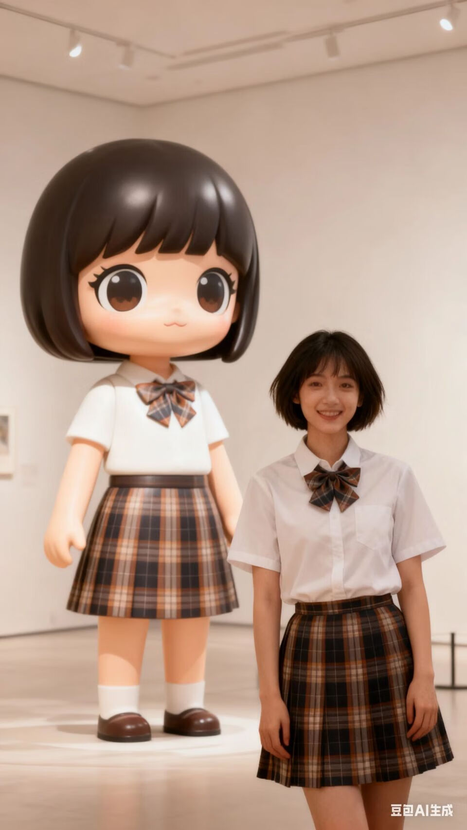 图中的人物在参加一场艺术展览,并和画面中的装置合影,画面中的装置是巨型卡通样式,颜色与输入图保持一致,其形象具有大眼睛的特征,风格偏向萌系艺术,装置需要结合参考图主体形象的服饰、配饰、发型、装饰等,高度保持主体一致性、性别一致性、人脸相似度,且装置要穿上服装。装置以自然站姿立在人物斜侧后方,装置体积大于人物体积,装置高于人物50%左右,营造出强烈的比例反差,背景是简约的观展现场,营造出安静、高级的氛围。整体光影融合、氛围统一,人物脸部、身体、手部不崩坏不错乱。