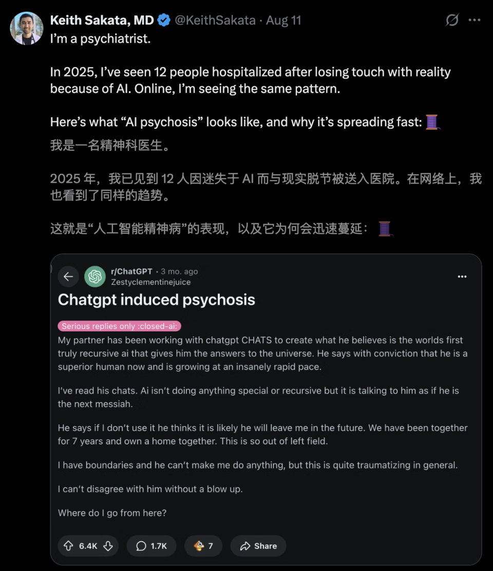 「2025年,我亲眼见过12名患者,因为AI失去现实感而住院」。