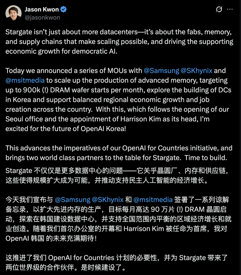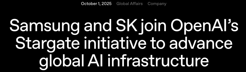 三星、SK与OpenAI共同宣布,作为OpenAI宏大的AI基础设施平台——「星际之门(Stargate)」计划的一部分,三方已达成全新的战略合作伙伴关系。