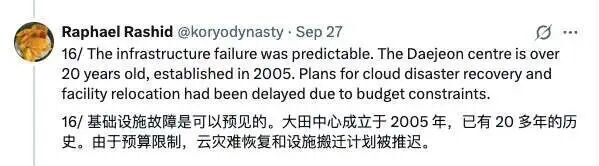 还有网友指出,这次崩溃早有迹象。大田中心建于 2005 年,已有 20 年历史。因预算不足,云灾备和设施搬迁计划一再推迟。