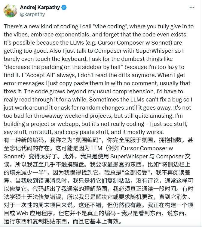 Andrej Karpathy把它形容为「顺着感觉写代码」,工程师也是第一次感受到「描述即开发」。